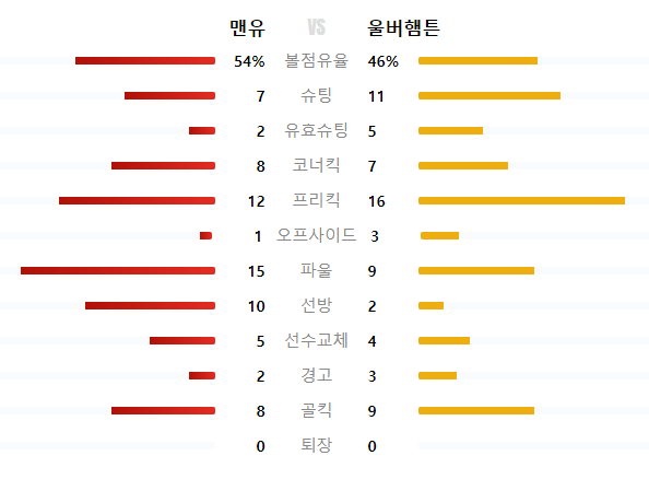 울버햄튼이 주도한 경기였다.축구 통계사이트 풋몹 기준, 울버햄튼이 점유율 49%로 약간 뒤졌지만, 슈팅 숫자에서 23대15로 압도했다. 유효슈팅에서도 울버햄튼이 7-4로 우위였다. 하지만 마침표를 찍어줄 선수가 없었다.